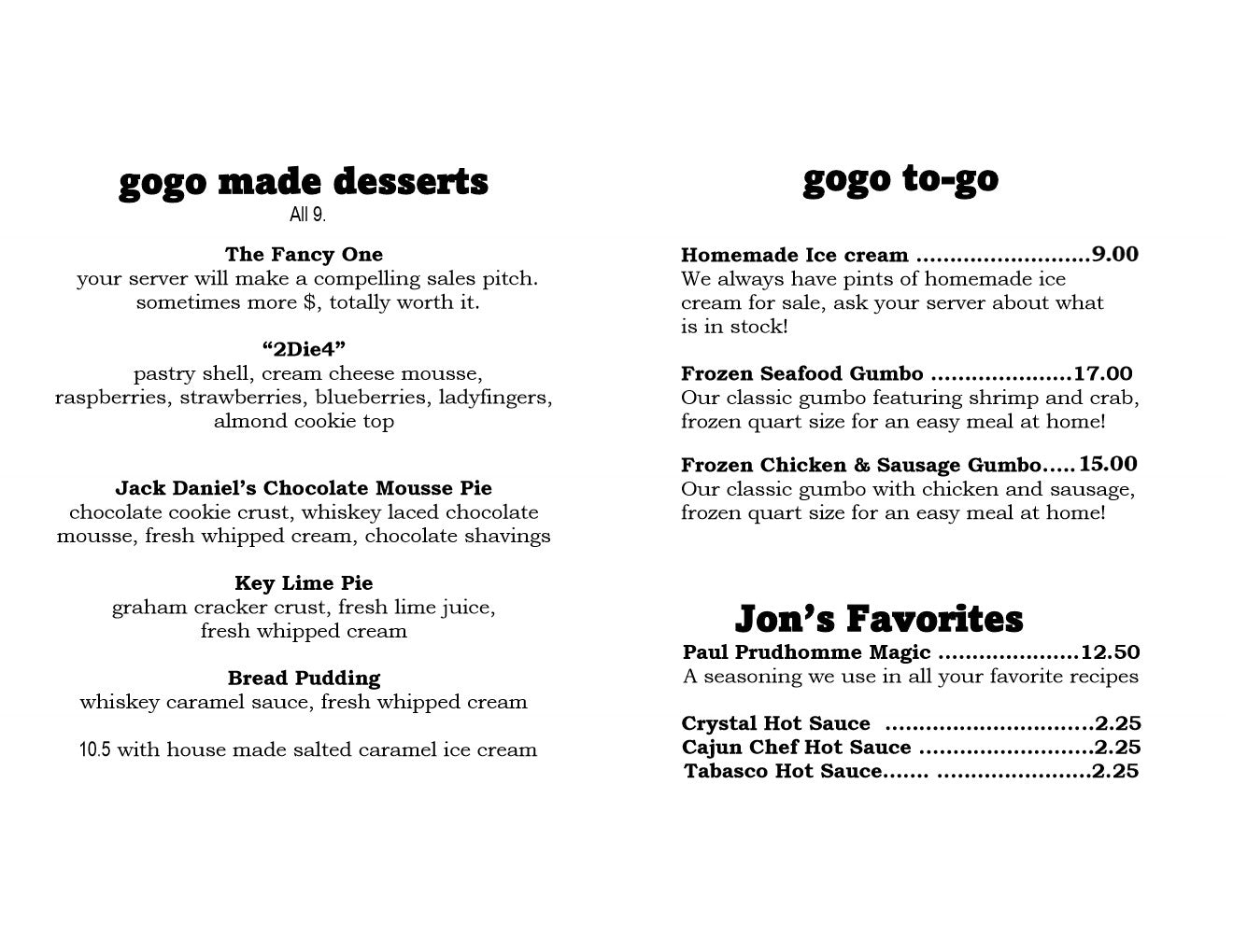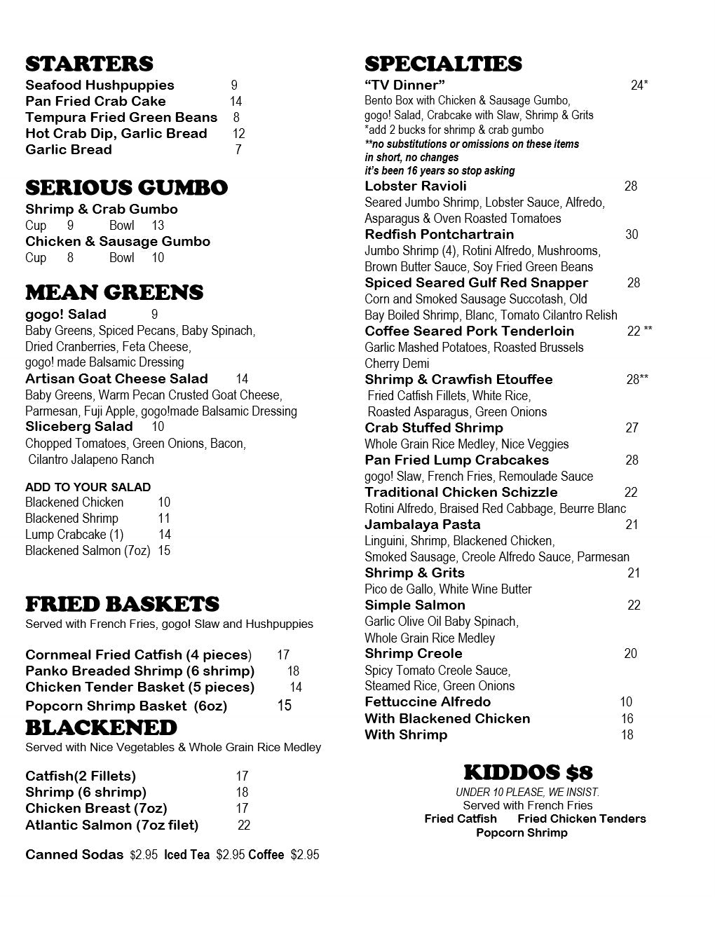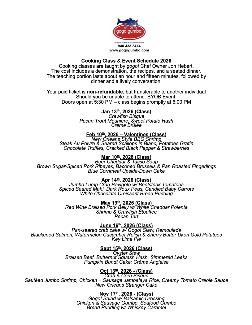 Cooking Classes are taught by gogo! Chef Owner Jon Hebert. The cost includes a demonstration, the recipes and seated dinner. The teaching portion lasts about an hour and fifteen minutes followed by dinner and lively conversation. Your paid ticket is non-refundable but is transferable to another individual should you be unable to attend. BYOB event.